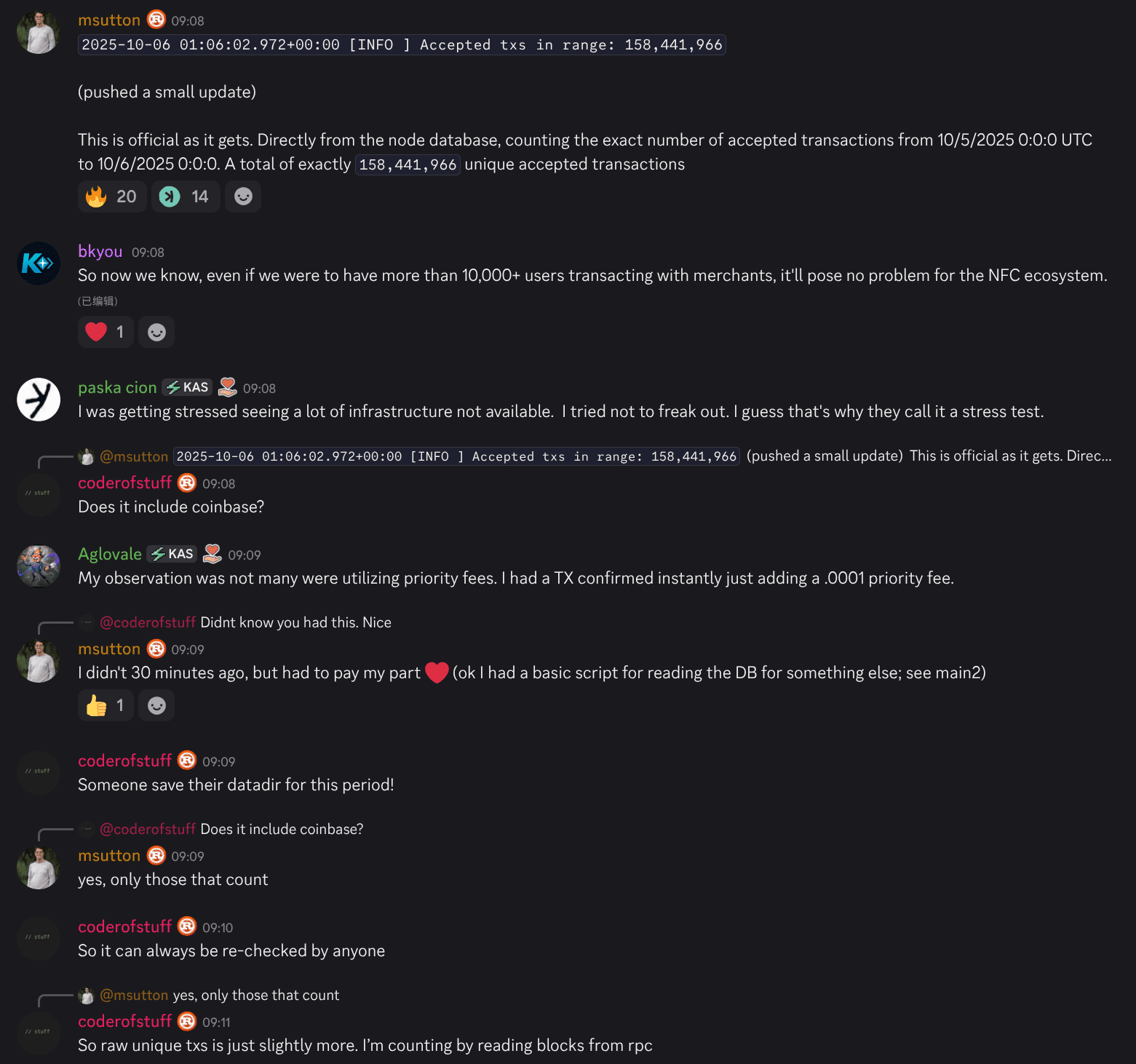 2025-10-05 00:00:00到2025-10-06 00:00:00的 24 小时内,Kaspa 组织了一次主网压力测试。TPS 长时间维持在两千多,总共完成超过 1.58 亿笔交易。主网运行稳定,转账没有延迟。