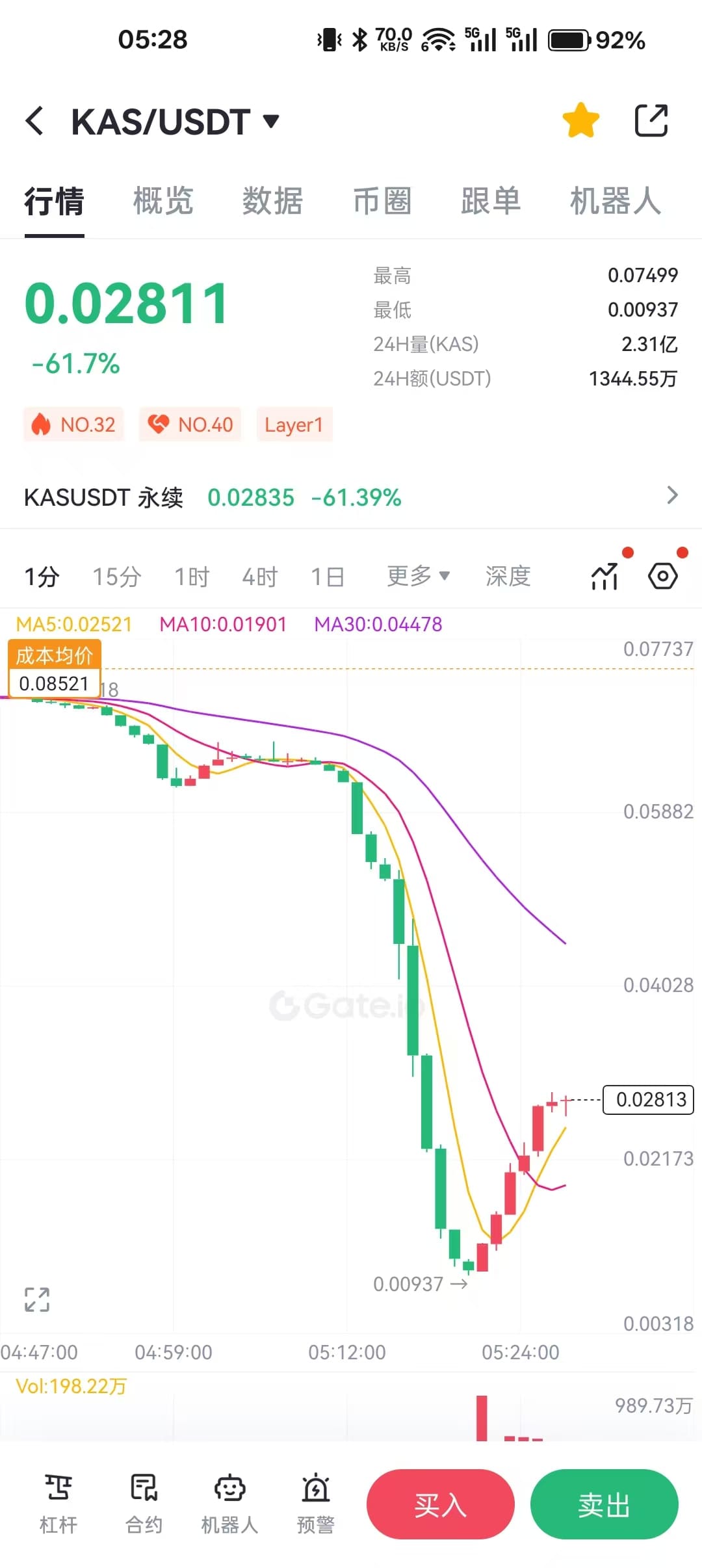 Kaspa 也在几十分钟内,从 0.07 下跌到 0.009,后来又反弹到 0.05 左右。很多人被爆仓。