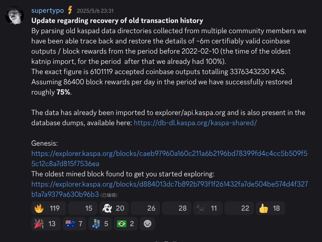 历史账本不完整,不影响 Kaspa 的安全。