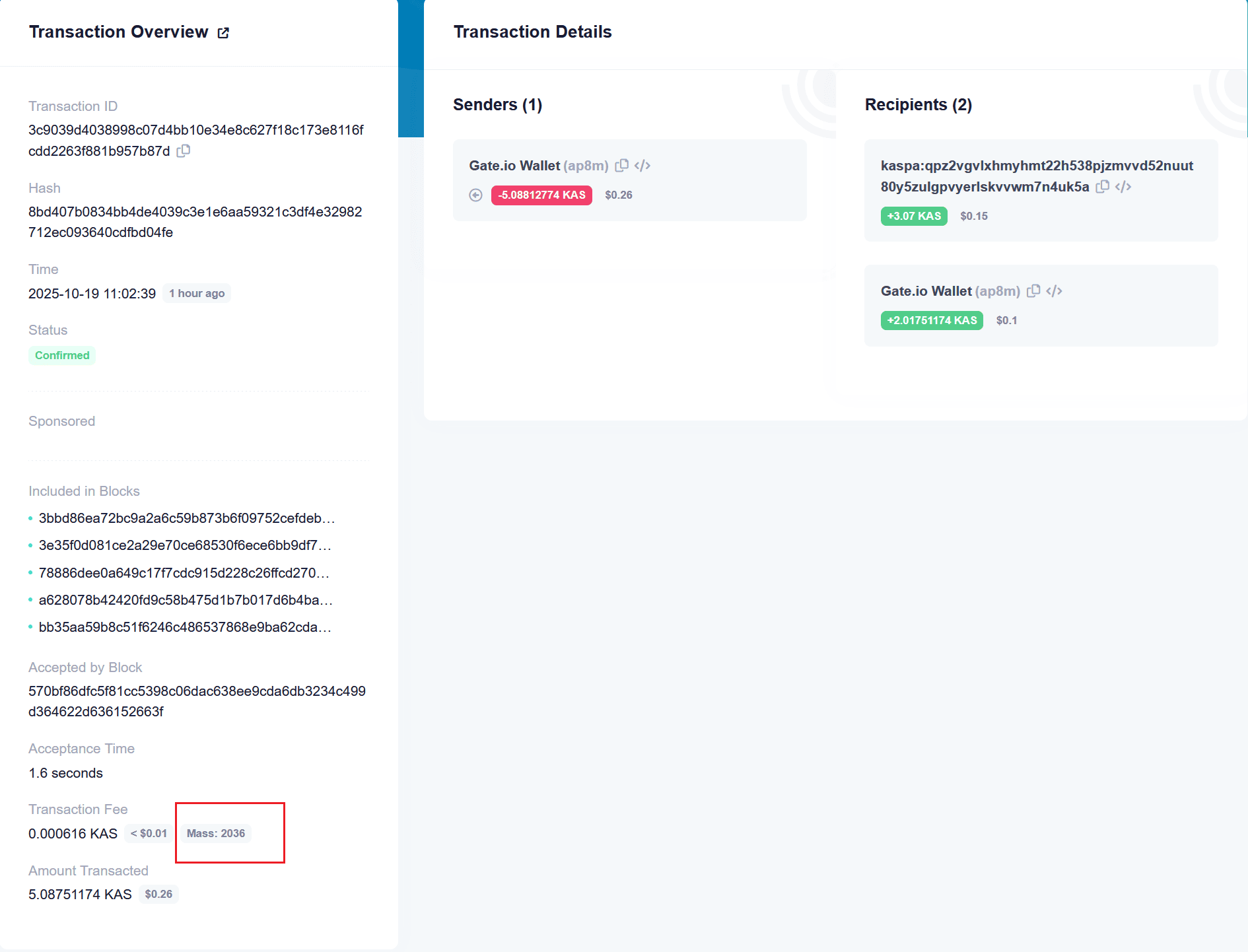 真实的交易场景更加复杂,可能会有更多的交易类型。在 kas.fyi 网站上,可以查看每笔交易的 Mass 的值,如: